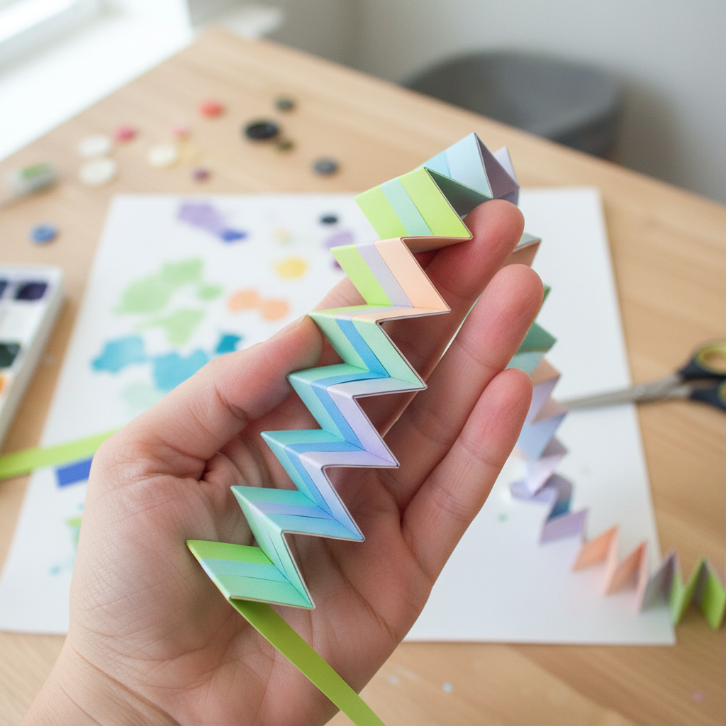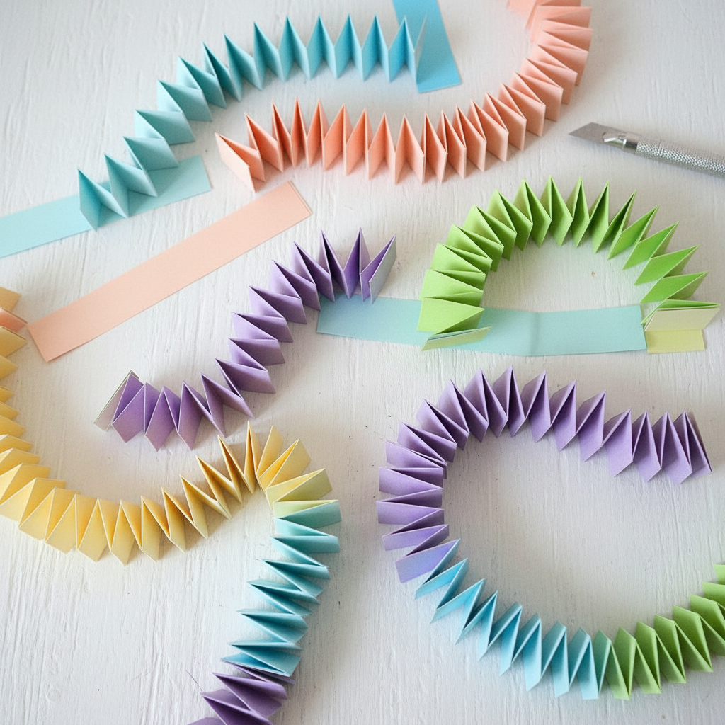 A decorative paper garland made from connected accordion-folded sections that stretches wide.