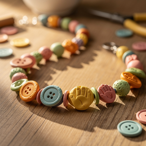 Create a colorful and textured necklace by combining homemade clay beads with your favorite buttons. A delightful screen-free family craft!